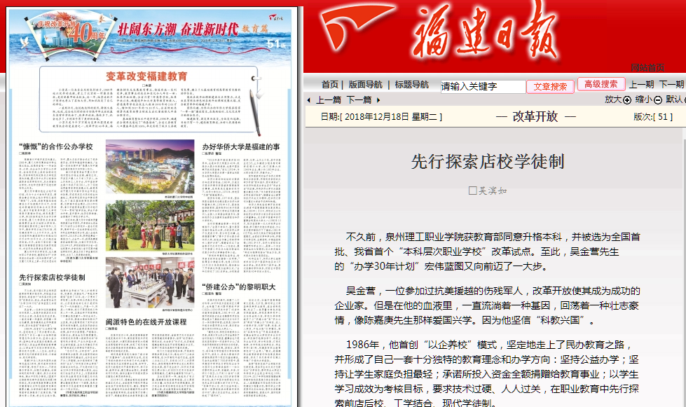 不久前,泉州理工职业学院获教育部同意升格本科,并被选为全国首批、我省首个“本科层次职业学校”改革试点。至此,吴金营先生的“办学30年计划”宏伟蓝图又向前迈了一大步。 吴金营,一位...