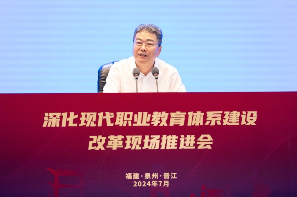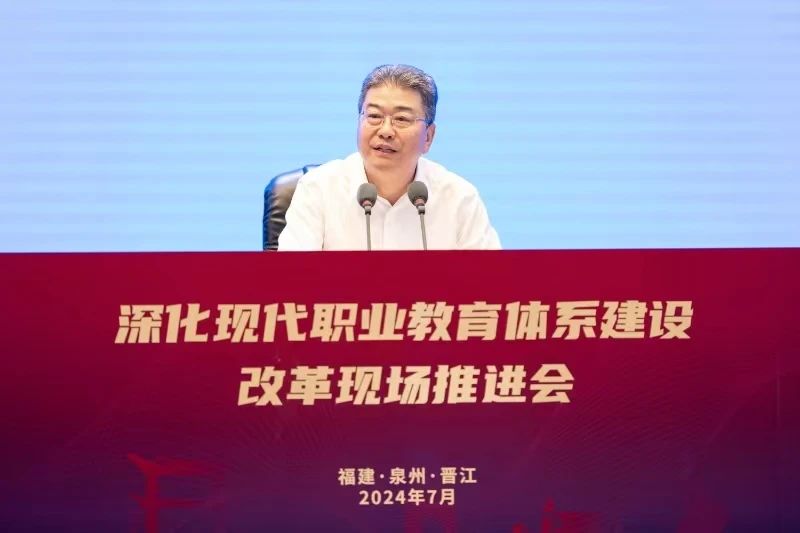 为深入贯彻党的二十大和二十届三中全会精神,落实教育部年中推进会部署安排,7月30日,深化现代职业教育体系建设改革现场推进会在福建晋江召开。教育部党组成员、副部长吴岩出席会议并作报告。福建省政府副省长李兴湖致辞,天津市政府副市长张玲、山东省政府副省长邓云锋、新疆维吾尔自治区政府副主席凯赛尔·阿不都克热木参加现场会。教育部职业教育与成人教育司司长彭斌柏主持。现场会期间,天津、重庆、广西代表省域现代职业...