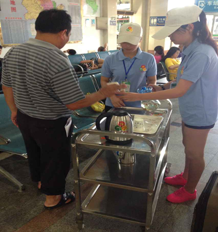 “小保姆”耐心帮助旅客购票 志愿者认真检查药品缺失情况和是否过期 志愿者为受伤群众清洗伤口 志愿者为旅客送上凉茶 8 月 16 日上午...