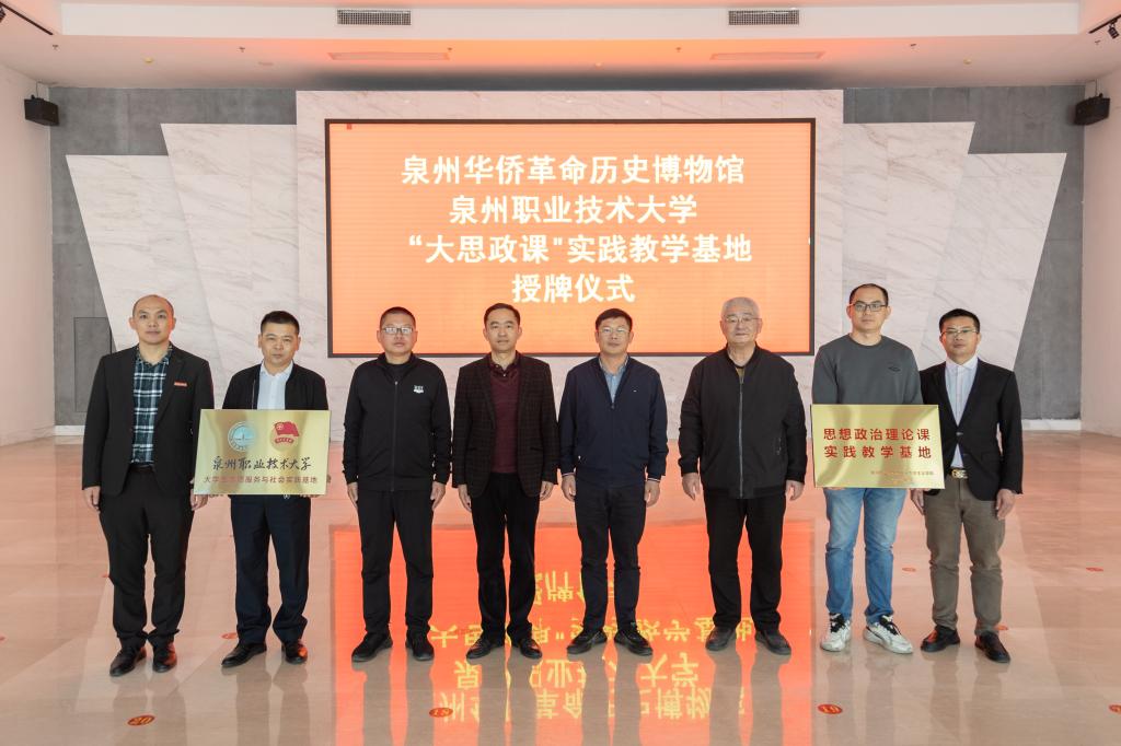 为讲好用好新时代“大思政课”,1月5日,泉州职业技术大学与泉州华侨革命历史博物馆举行共建“大思政课”实践教学基地授牌活动。我校党委书记傅志雄,校党委组织部部长、马克思主义学院院长来永宝教授分别向泉州华侨革命历史博物馆授予“大学生志愿服务与社会实践基地”、“思想政治理论课实践教学基地”牌匾,泉州华侨革命历史博物馆馆长郑锋颖代表博物馆接牌,金淘镇党委书记黄俊加、金淘镇党委副书记林玮鹏、泉州华侨革命历...