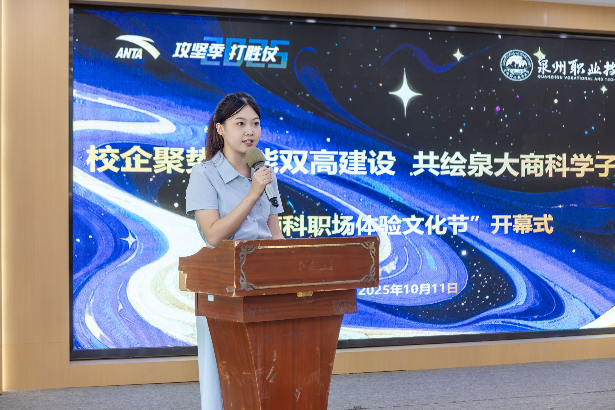 10月11日下午,泉州职业技术大学商学院商科职场体验文化节开幕式在校内 A533 会议室举行。活动以 “校企聚势赋能双高建设,共绘泉大商科学子未来” 为主题,福建安踏物流信息科技有限公司仓储运营经理李飒、ESG 经理陈健,我校商学院院长姚宏伟、商学院党总支书记叶城锋,25 级学业辅导员、班主任,及 2025 级电子商务、大数据与财务管理、大数据与会计、现代物流管理专业等全体同学出席,活动由商学院学业辅导员姚冬梅主持。活...