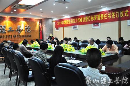 4月 19日下午,泉州理工学院召开 2011年安全稳定会议暨目标管理责任书签订仪式,学校与17个二级单位“一把手”签订安全目标管理责任书,通过一系列措施打造平安校园。 会上,校党委副书记苏白茹传达了市教...