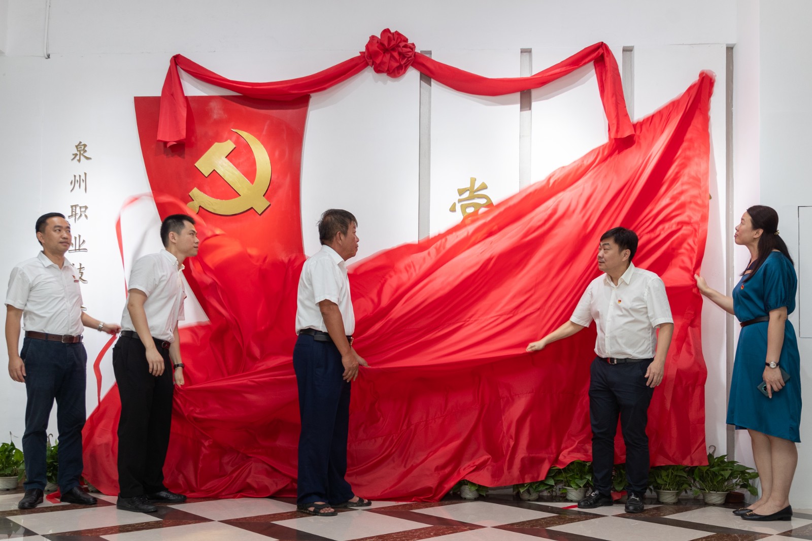 泉州市高教中心办主任陈志刚、副主任李冬英,内坑镇副镇长丁诗铃,学校董事长吴金营、党委书记傅志雄共同为党建馆揭牌。