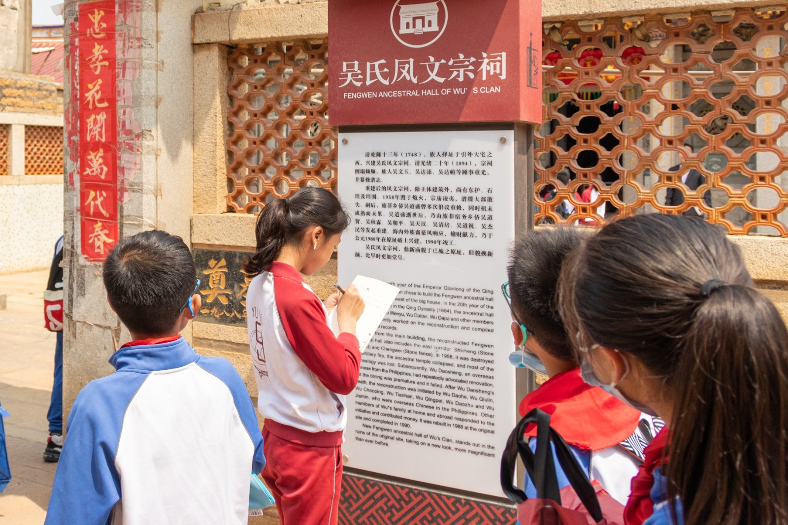 教育需要实践,成长需要体验。随后,大小记者开展了以 “绿色渔村”为主题的研学活动,深入到围头村几处重要的宗祠、古厝进行参观、采访。