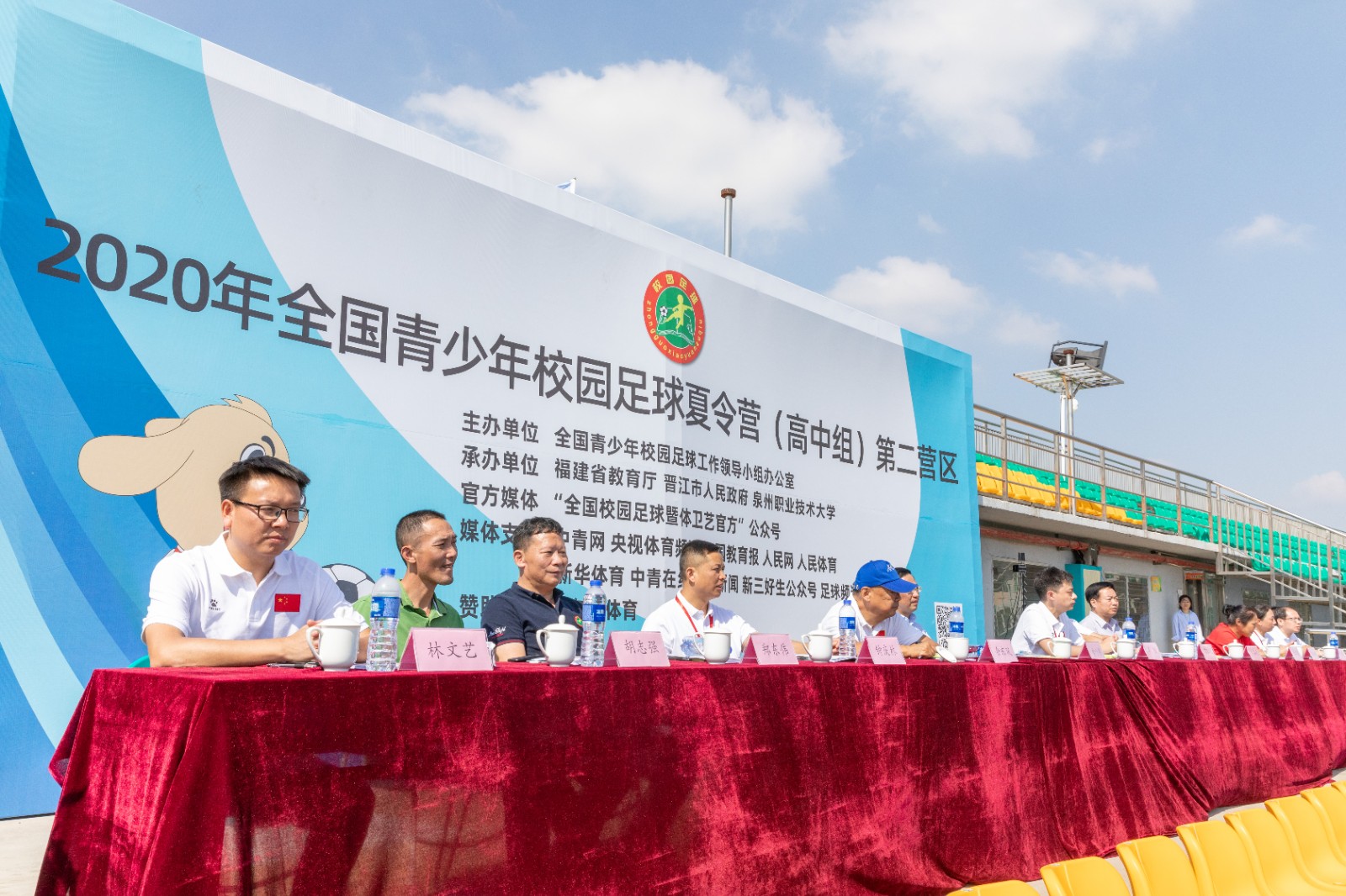 教育部体育卫生与艺术教育司体育与卫生处副处长李阳、福建省教育厅体育卫生艺术教育与语言文字处处长苏贻堆、晋江市人民政府副市长黄少伟、泉州职业技术大学党委书记林其天、全国青少年校园足球专家委员会训练竞赛组副组长余东风、中国大学生体育协会足球分会副秘书长杨璟勇、本届夏令营裁判长/国际级裁判李娟、福建省教育厅体育卫生艺术教育与语言文字处副处级干部钟庆林、福建省教育厅体育卫生艺术教育与语言文字处原调研员陈丽红、泉州市教育局体育卫生艺术教育与语言文字科科长郑东伟、晋江市教育系统党委专职副书记蔡朝阳、泉州市教育局体育卫生艺术教育与语言文字科四级主任科员胡志强、卡尔美(中国)有限公司市场部经理柯清溪、泉州职业技术大学副校长林文艺,以及中外方专家等领导和嘉宾出席2020年全国青少年校园足球夏令营(高中组)第二营区开营仪式。开营仪式由中国大学生体育协会足球分会副秘书长杨璟勇主持。