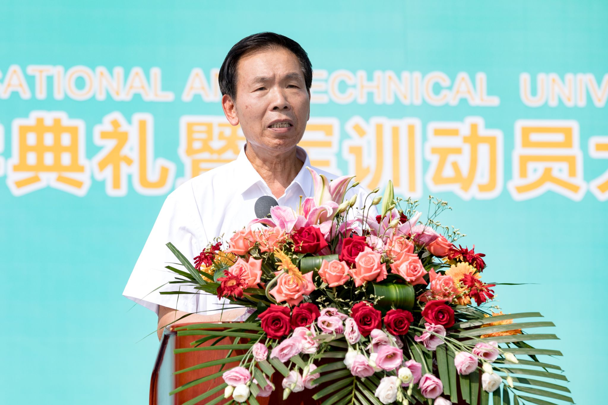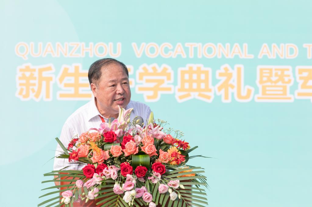 金色九月清风送爽,硕果飘香。9月9日我校2019级新生开学典礼暨军训动员大会在田径运动场隆重举行。学校创办人/董事长吴金营、校长臧树良、校党委书记林其天、学校教育基金会理事长杨培琛、学校副董事长吴璐吟、学校实训基地副总经理张文协、校党委委员/副校长庄文瑞、副校长姚丹、副校长郭霏霏、副校长蔡金佩、校党委委员/副校长林文艺、一级职业指导师校党委委员/工会主席陈其生、校党委委员/人事处处长钱玉琴、校务顾问翁长武、校长助理苏康敏、校党委委员/学生工作处处长/武装部部长杨津平以及各学院部门负责人、副高以上教师代表辅导员及2019级全体新生参加。出席本次开学典礼的嘉宾有晋江市武装部部长赖中平、晋江市内坑镇党委书记黄胜鑫、泉州市高教发展中心管理委员会办公室主任陈志刚、晋江市武装部副部长胡苏楠、晋江市内坑镇派出所所长李进益、晋江市内坑镇人民政府副镇长张辉永、晋江市内坑镇派出所指导员郑丽绥。杨津平主持典礼。