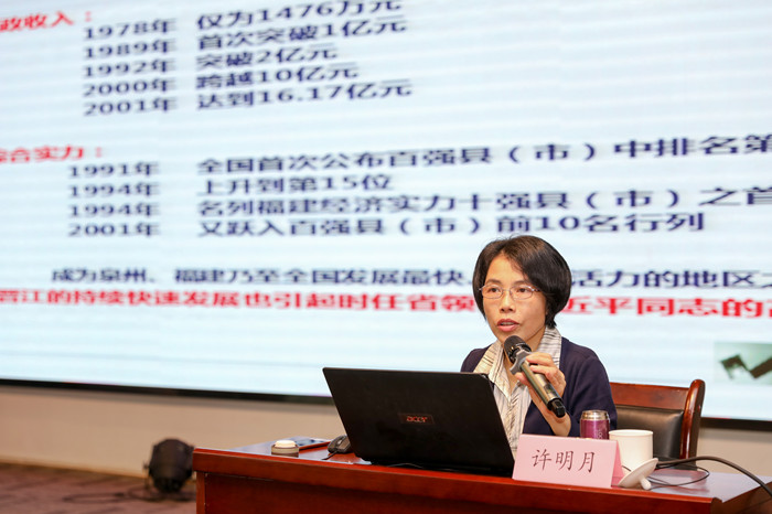 主题宣讲活动邀请了晋江市委党校许明月高级讲师作《弘扬“晋江经验” 推动高质量发展落实赶超》的专题报告。许老师从改革开放的重要意义和今年7月中央各大主流媒体对“晋江经验”的宣传热潮引出传承弘扬“晋江经验”的重大意义。报告围绕“晋江经验”的提出背景和重要意义、“晋江经验”的深刻内涵和传承弘扬“晋江经验”推动高质量发展落实赶超三大方面展开。许老师从改革开放前的晋江经济讲到改革开放后晋江如何成为泉州、福建乃至全国发展最快、最具活力的地区之一,阐述了“晋江经验”的提出背景和具有的重要意义,其内涵与习近平新时代中国特色社会主义思想是一脉相承、高度契合的;结合晋江经济发展、晋江精神、晋江诚信立市、立足本地优势、政府引导服务、基础设施建设、城市建设、品牌建设等各方面详细分析了“六个始终坚持”和“处理好五大关系”的“晋江经验”的深刻内涵;讲述了站在改革开放40周年的新起点,立足晋江发展的各方面需求,将“晋江经验”传承好、发展好的必要性,以推动高质量发展落实赶超,续写晋江改革发展新篇章。