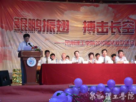 苏志明校长在典礼上致词,回顾了昨天、感怀了今天、展望了明天。他代表学校对大家在大学三年期间为学校建设做出的贡献表示衷心感谢,学校将永远是大家美好的回忆。他对同学们经过努力完成学业而顺利毕业表示衷心地祝贺。党委书记吴金营也在典礼上发表了讲话,他希望我们的毕业生发扬理工人的精神,不断加强学习,努力投身实践,一如既往地关心、支持母校的发展。紧接着,教师代表、在校生代表、毕业生代表也上台发表感言,并献上了最真挚的祝福。伴随着激动人心的欢快乐曲,校领导亲自为 2010届毕业生代表颁发毕业证书。