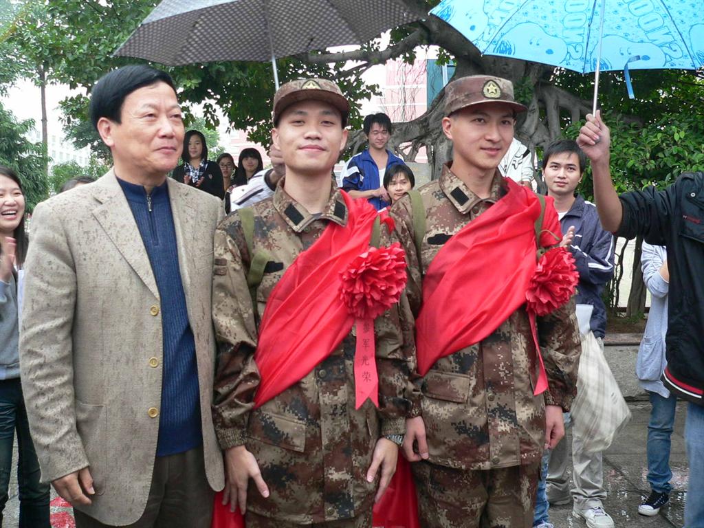 在出发之际,入伍学生纷纷表示,绝不辜负老师和同学的期望,将勤奋学习,刻苦训练,把自己锻炼成为对国家、军队有用的高素质人才,以回报祖国、回报母校。一声声叮咛、一句句关怀,应征入伍的学生与同学老师拥抱告别,校长苏志明还为他们佩戴光荣花并与他们合影留念。