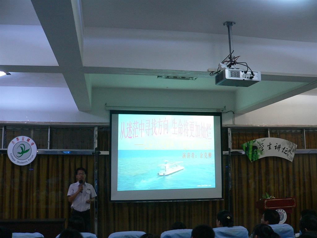 大学生讲坛本着:“启迪思维、加强修养、开阔视野”的宗旨为我校同学逐步开启成功的钥匙。本次“大学生讲坛”特别邀请了我校04级工商企业管理毕业生(现任泉州市金海洋文化培训学校董事长)余克彬为同学们主讲题为“从迷茫中寻找方向,生命将更加精彩”的讲座,现场气氛十分热烈,余克彬学长的精彩演讲受到在场同学们的一致好评。