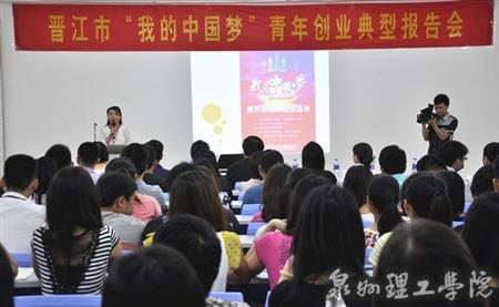 5月23日晚19:30,泉州理工学院晋江校区教学楼238室掌声不断,由晋江团市委、泉州理工学院团委联合举办的“我的中国梦”青年创业典型报告会在此举行,晋江团市委书记柯枫伟、晋江团市委常委陈世景,学院副院长吴滨如、党委副书记黄志梅,学工处、校团委、各系团总支负责人以及大一、大二学生骨干共计250多人参加报告会。