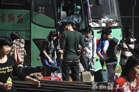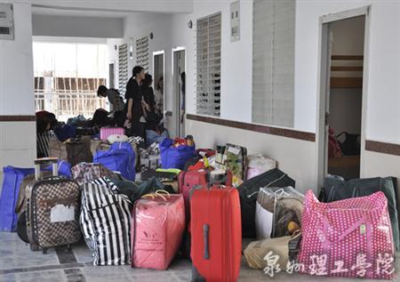 3月9日,在泉州理工学院泉州校区,一辆辆大货车满载着行李缓缓驶出校园,一批批男女学生或背或扛着大包小包,往货车上装行李,这是新学期泉州理工学院搬迁前往晋江新校区的一幕。