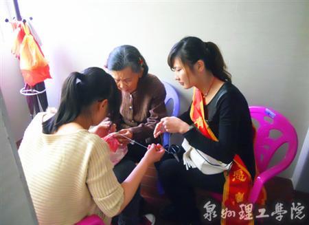 为敬老院的老爷爷老奶奶们帮忙洗衣服洗被子、缝补衣服、为老人们演唱闽南语歌曲,陪老人们聊天。