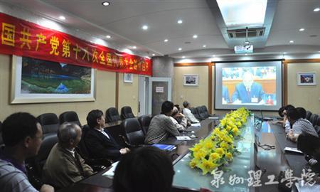 泉州理工学院在泉州校区思恩楼一楼会议室、电视厅、 3A 学术报告厅分别设立视频会场,学校党政领导、各系(部)领导及广大师生认真观看了大会盛况。仔细聆听胡锦涛总书记代表第十七届中央委员会所作的题为《坚定不移沿着中国特色社会主义道路前进 为全面建成小康社会而奋斗》的报告。