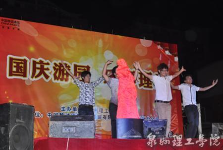 晚上7点,游园晚会在操场举行。晚会内容丰富多采,不仅有悦耳的歌声,还有街舞、相声、时装秀等炫目表演。舞台上的灯光绚丽多彩,歌声优美动听,精妙绝伦的街舞等五一不引起现场观众的欢呼呐喊。