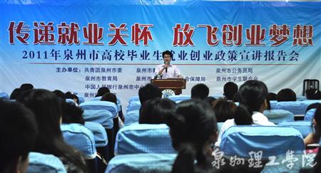 由共青团泉州市委联合泉州市教育工委、泉州市公务员局、泉州市教育局、泉州市人力资源和社会保障局、泉州市学生联合会及中国人民银行泉州支行等部门组成的“泉州市高校毕业生就业创业政策宣讲。