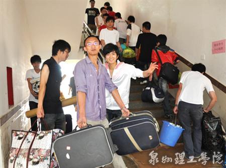 09级师生,党委书记吴金营带领部分教职工在新校区热切欢迎到来的师生。老师帮学生拎行李,男生帮女生扛包裹,同学一起抬重物,新校区一片热闹景象。