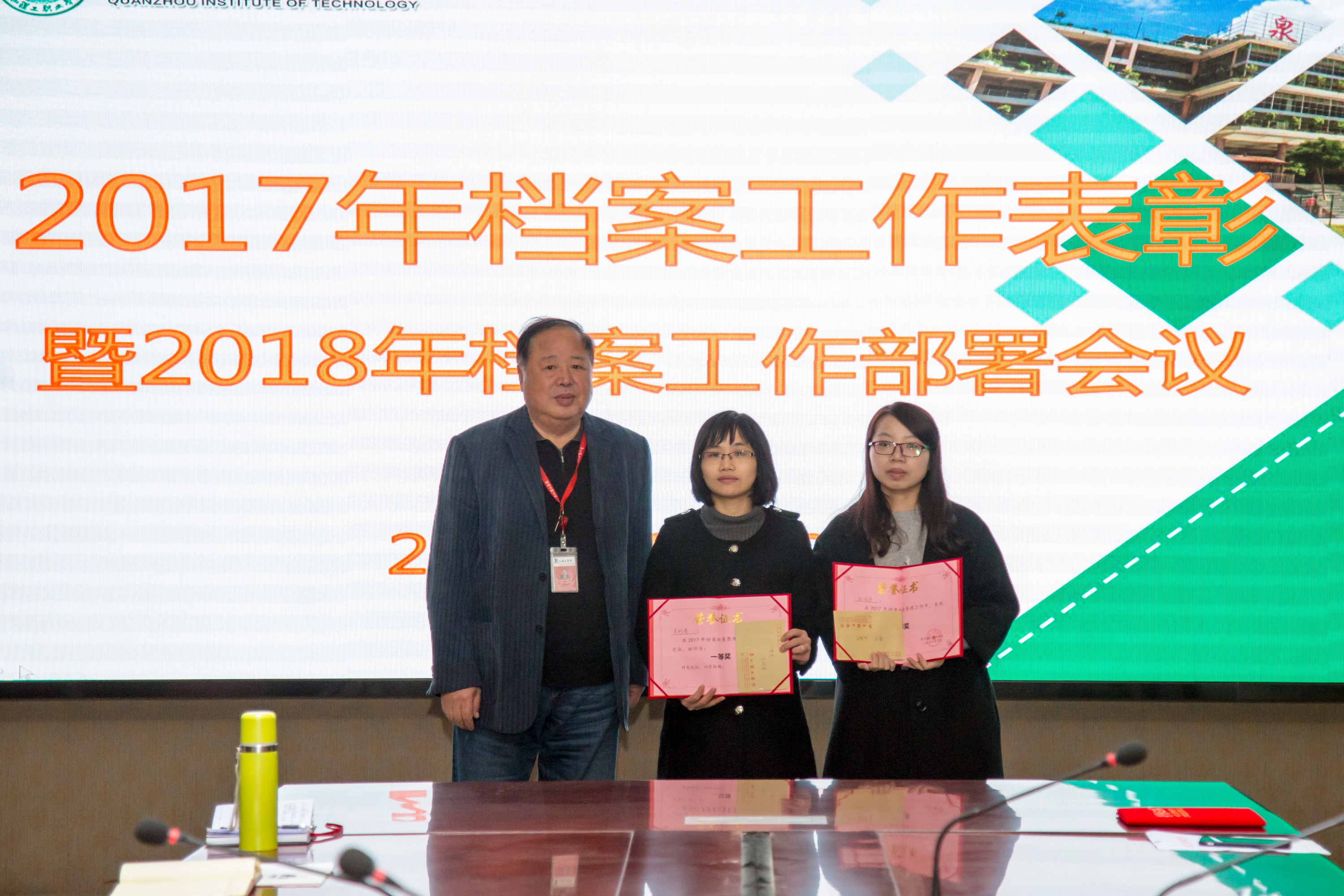 臧校长、林文艺主任、校长助理郭霏霏为受表彰的兼职档案员颁奖,希望受表彰的同志们戒骄戒躁,进一步做好今后的档案工作,为学校永续长远发展做出贡献。