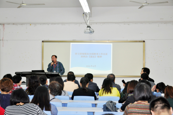 臧校长在会上宣读了全国教育工作会议目标与任务,并要求学校从2015年开始,实施教育规划纲要进入第二个五年,基本实现教育现代化进入全面攻坚阶段,重点做好9方面工作。一,深入学习贯彻习近平总书记系列重要讲话精神,二,把社会主义核心价值观落小落细落实,三,集中力量解决教育公平中的紧迫问题,四,调整教育结构,提高教育质量,五,推动教育综合改革取得更大突破,六,大力提升依法治教的能力和水平,七,深化教育国际交流和合作,八,千方百计提高教育经费筹措能力使用效益,九,加强和改进教育系统党的建设。