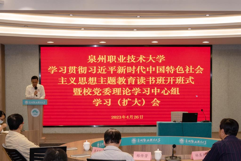 4月26日下午,泉州职业技术大学举行学习贯彻习近平新时代中国特色社会主义思想主题教育读书班开班式暨党委理论学习中心组学习(扩大)会。
