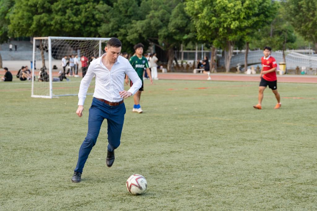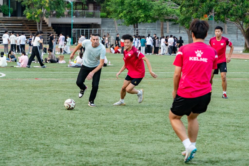 最后,Facundo Simon一行与我校足球队、休闲体育学生来到足球场,来宾们脱下西装,在绿茵场上奔跑、挥洒汗水,现场踢球、传球、颠球,快乐地与同学们互动交流,共同感受足球运动的独特魅力。