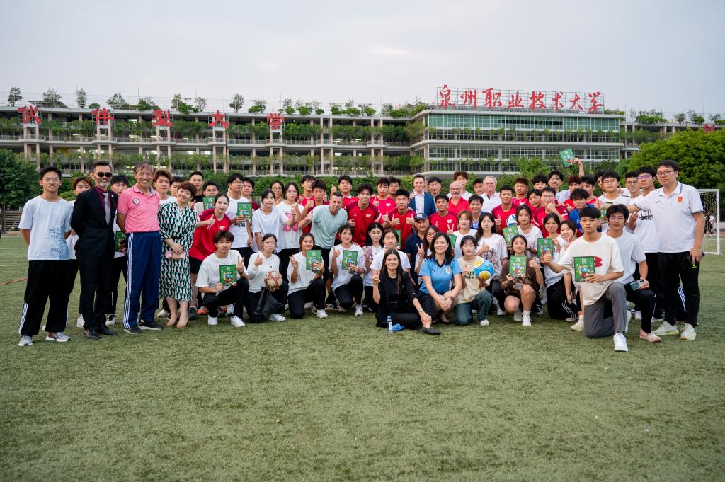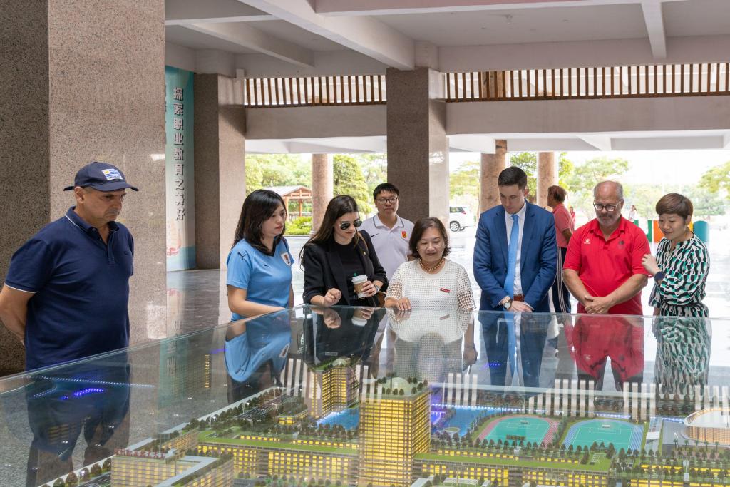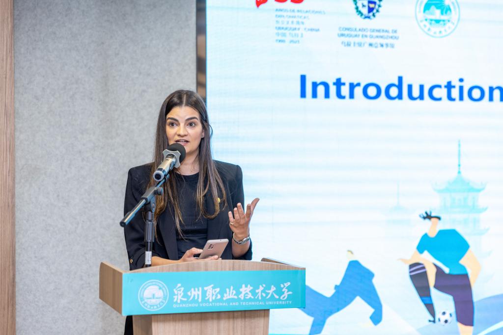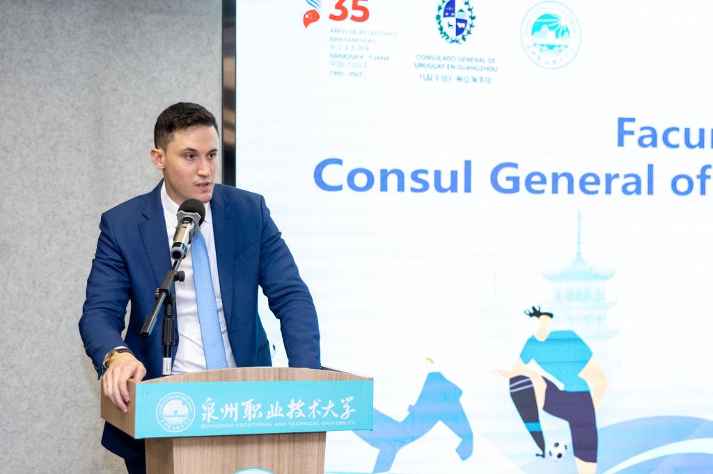10月26日,乌拉圭驻广州代总领事Facundo Simon及夫人Ana Laura等一行莅临泉州职业技术大学,与我校共同开展庆祝中国-乌拉圭建交35周年系列活动暨足球文化交流活动。乌拉圭驻广州代总领事秘书钟弦、乌拉圭共和国大学体育部主任Marcelo Palumbo、乌拉圭足球教练 Leonardo Jara等陪同,我校校长吴滨如、校务顾问姚丹、副校长林文艺等领导,与我校足球队40多名队员、2023级休闲体育专业学生80多人参加活动。