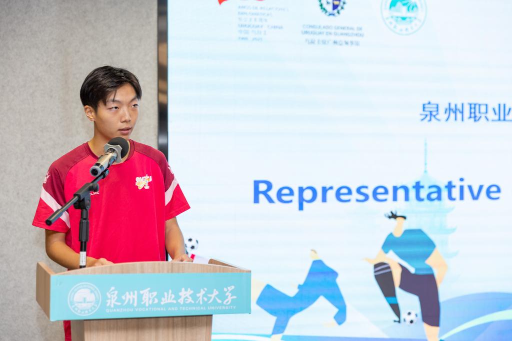 我校足球队代表潘越发言,向乌拉圭驻广州代总领事Facundo Simon一行的到来表示欢迎。他介绍我校有悠久的足球文化传统,学校领导、老师、校友们自始至终大力支持学校体育运动的开展。Facundo Simon一行来学校推广足球文化和书籍,是我校足球队学习、开拓眼界的难得机会,期待能与乌拉圭籍教练交流、向其学习,更希望未来能建立更加紧密的联系。