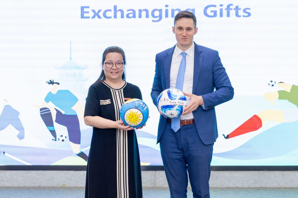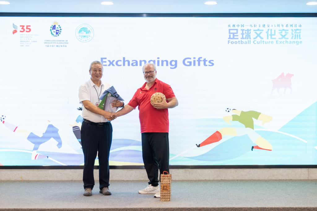 ❖ 教育学院院长张君代表泉大足球队、Marcelo Palumbo代表乌拉圭足球队互赠礼物