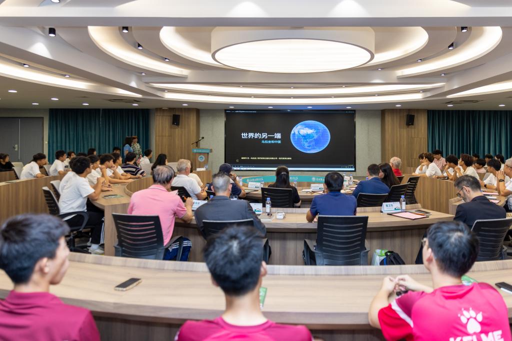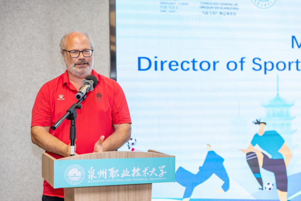 乌拉圭共和国大学体育部主任Marcelo Palumbo 发言,表示很荣幸能在泉大介绍乌拉圭足球文化,此次18名乌拉圭足球队队员带着荣誉感和使命感,从遥远的乌拉圭来到中国、来到晋江参加2023年国际大体联足球世界杯,给大家展示足球运动的魅力、与大家交流足球文化。很感谢主办方和当地政府为球队提供的帮助和支持。