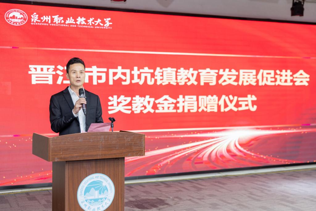 ▲ 晋江市内坑镇教育发展促进会(秘书长吴志辉代表)向泉州职业技术大学(校务顾问姚丹代表)捐赠奖教金5万元