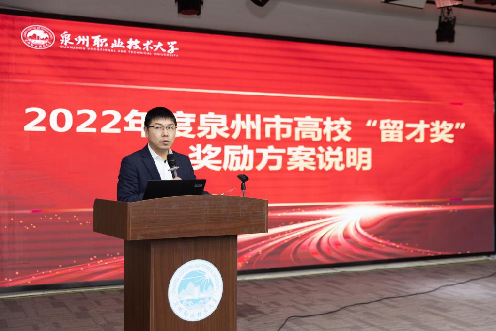 ▲ 党委副书记、副校长蔡金佩做2022年度泉州市高校“留才奖”奖励方案说明