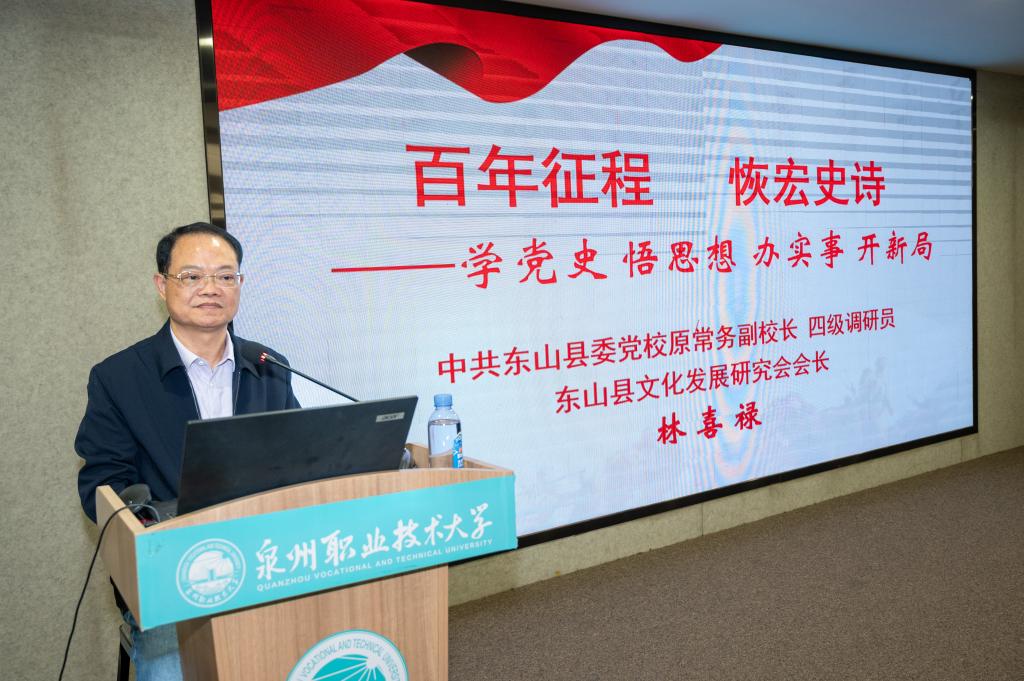 聘任仪式后,林喜禄作《百年征程 恢宏史诗——学党史 悟思想 办实事 开新局》专题讲座。他紧紧围绕党史学习教育,从开展党史学习教育的重大意义、中国共产党的主要发展历程、党史学习教育的工作要求三个方面进行了系统阐述,全面回顾了中国共产党的百年奋斗历程,详细讲解了新民主义革命时期、社会主义革命和建设时期、改革开放和社会主义现代化建设时期的党史,鼓励全体师生同志要发扬红色传统、传承红色基因,赓续共产党人精神血脉,始终保持革命者的大无畏奋斗精神,鼓起迈进新征程、奋进新时代的精气神。