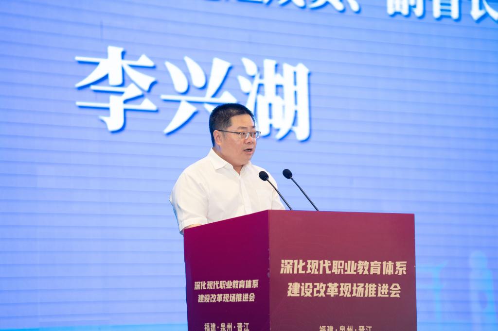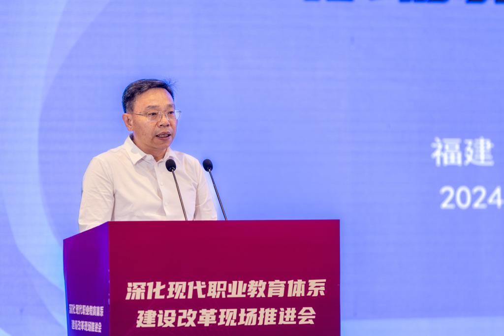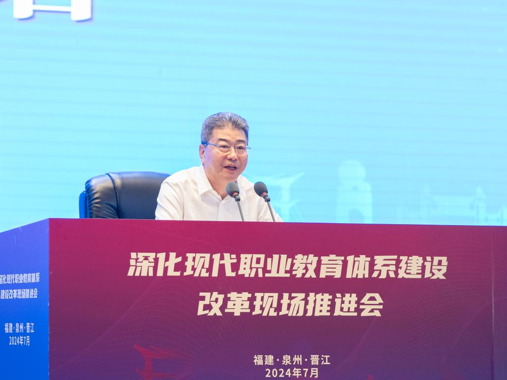 为深入贯彻党的二十大和二十届三中全会精神,落实教育部年中推进会部署安排,7月30日,深化现代职业教育体系建设改革现场推进会在福建晋江召开。教育部党组成员、副部长吴岩出席会议并作报告。福建省政府副省长李兴湖致辞,天津市政府副市长张玲、山东省政府副省长邓云锋、新疆维吾尔自治区政府副主席凯赛尔·阿不都克热木参加现场会。教育部职业教育与成人教育司司长彭斌柏主持。