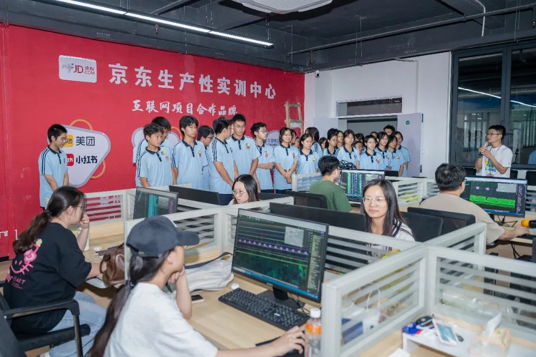 ▲ 商学院院长助理郭学超带领学生们参观安踏电商服务产业学院、京东校内生产性实训