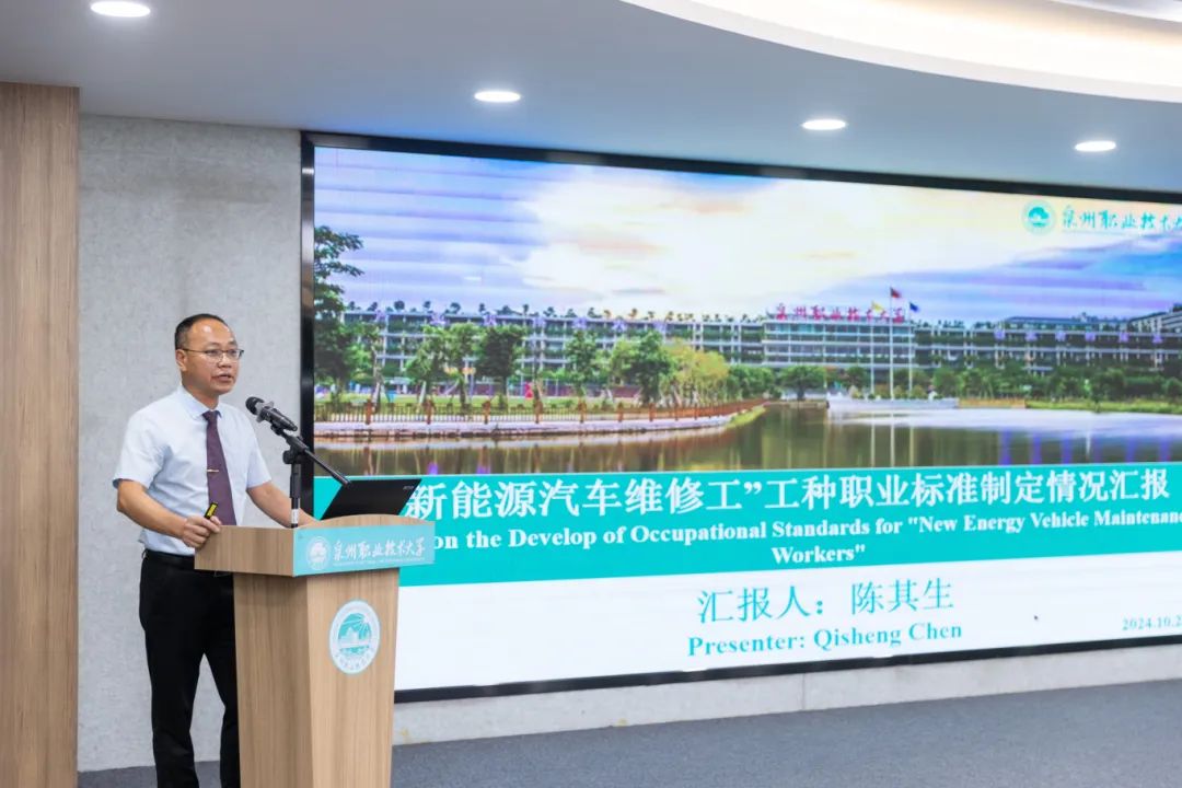 紧接着,工学院书记、副院长陈其生从新能源汽车专业群建设情况、新能源汽车职业标准开发能力、制定计划与合作展望三大方面,详细作“新能源汽车维修工”职业标准制定情况汇报。