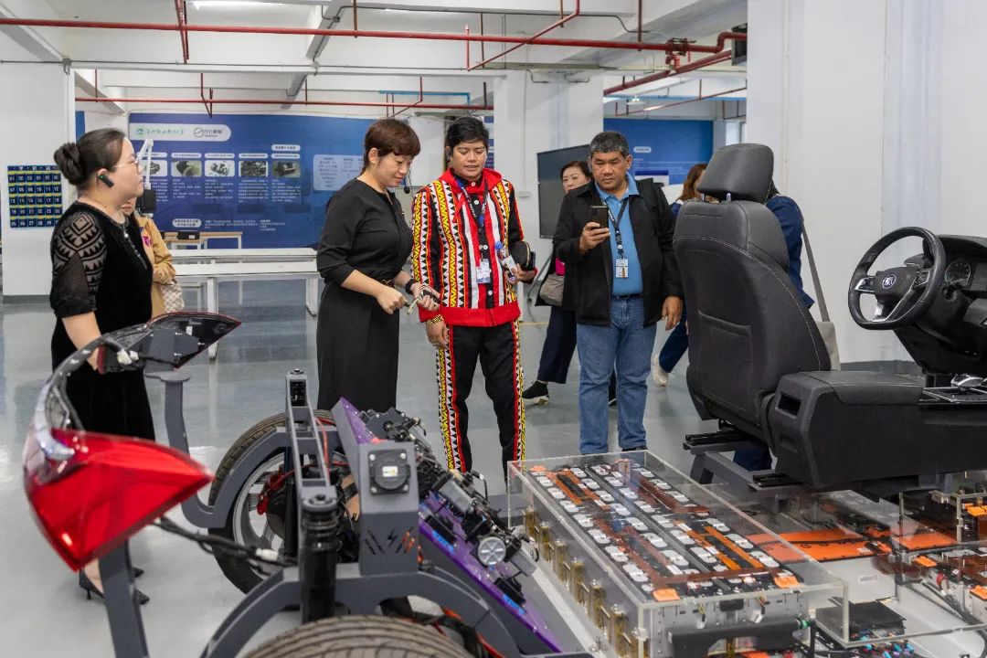 在新能源汽车产业学院,嘉宾一行详细了解学院产教融合、专业布局等情况,了解新能源汽车中高本衔接人才培养、新能源汽车工程技术专业(中本3+4贯通)人才培养等情况。同时,他们还考察了学校与北方汽车共建的新能源汽车创新实践基地。