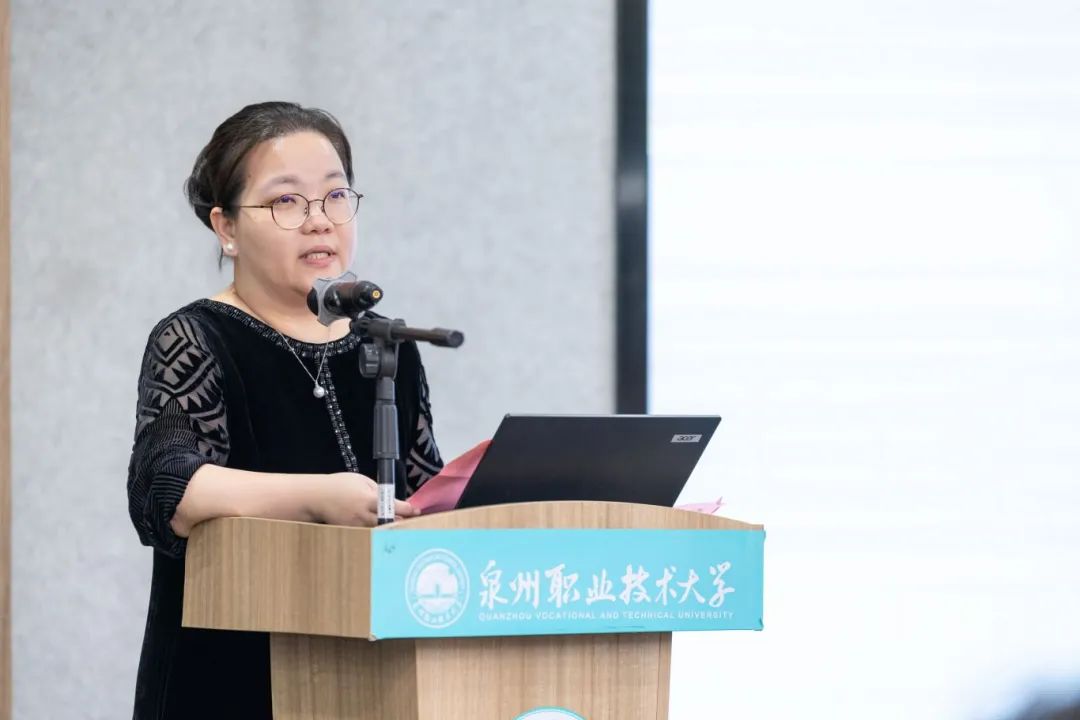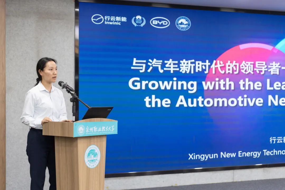 行云新能科技(深圳)有限公司培训经理王克静从行云新能源汽车产业学院合作、服务比亚迪与华为等行业龙头企业、参与国家标准和行业标准制定、开展国家级与省级各层次技术技能培训及认证等,作详细汇报。