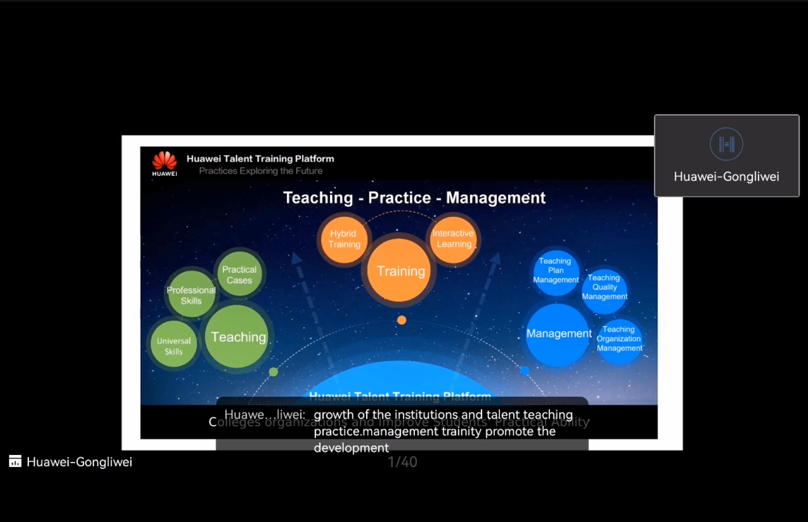 龚李伟首先从华为的发展历程、研究创新和合作交流开始介绍,展示华为的业务图景;其次,结合国内外真实案例,详细讲解信息通信技术人才培养方案、产教融合培养和资质认证体系,让大家了解专业发展趋势,更好地规划和布局未来;在自由交流环节,大家从云计算、大数据、人工智能、5G技术和物联网等方面出发,结合教学、技术应用过程中的体会,以及未来就业展开讨论。
