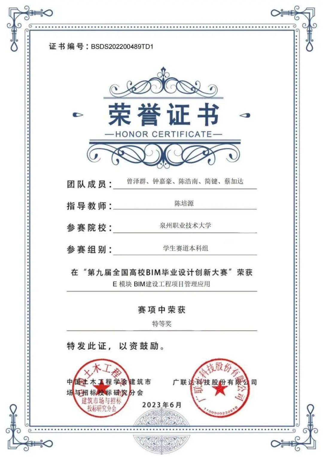 师生们这次获嘉奖,又为BIM工程应用中心再添荣誉。中心的成绩单“热辣滚烫”:金砖国家职业技能大赛“国际优胜奖”“全国一等奖”;全国高校BIM毕业设计创新大赛“特等奖”“一等奖”;一带一路暨金砖国家技能发展与技术创新大赛“一等奖”……近4年,累计荣获BIM各类重要赛事,国际优胜奖1项,全国总冠军1项,全国特等奖7项,一等奖40项,二等奖71项,三等奖88项,累计荣获全国三等奖及以上208项;福建省一等奖10项,二等奖13项,累计荣获福建省二等奖及以上23项。