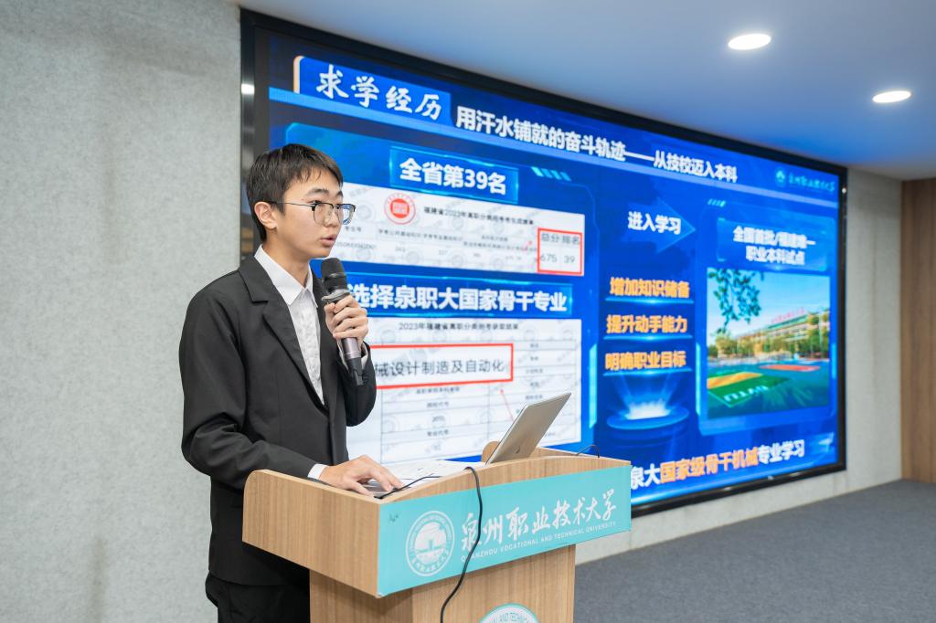 2024年国家奖学金获得者、2023级机械设计及自动化专业学生陈彬在分享中提到他与现场各位学弟学妹们一样,初中毕业后就坚定地选择了以“技”报国这条路,进入了国家重点技工院校佛山技师学院,并最终通过春季高考考入了泉州职业技术大学,他以自身经历给学弟学妹们提供了宝贵的求学经验。