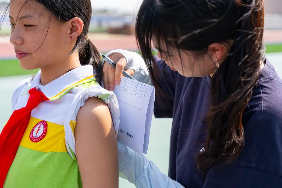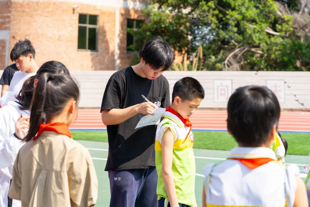 小学操场上,休闲体育专业的学子半蹲身子,在孩子身前身后,一会伸出双手拇指在孩子后背测量、一会伸出几根手指放在脊柱位置比划、一会又细细端详着孩子的侧肩……阳光洒在脸上,忙碌检查中,汗水从学子脸上淌下,但是,看着眼前这群活泼可爱的小学生,学子们脸上笑得灿烂。2022级休闲体育4班的苏志强明显感觉到,跟这群孩子们在一起,自己心情非常好,感觉就像回到童年一样开心。