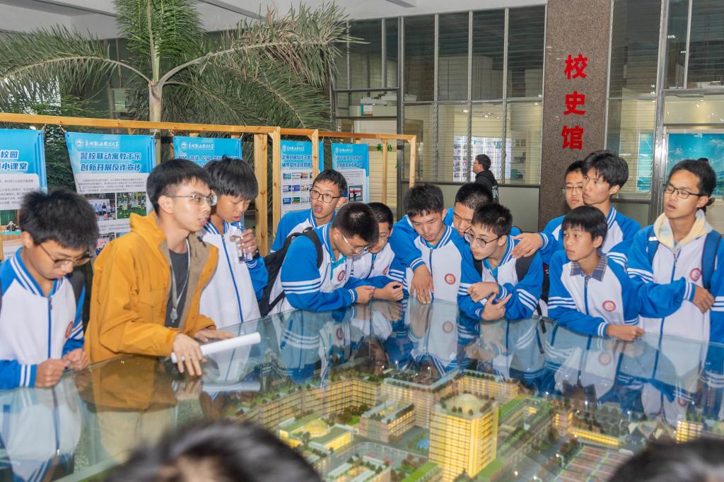 分享结束后,王汉池、黄绍金老师带领晋江华侨职业中专学校同学一同参观学校整体布局、校史馆、汽车工程中心等,向他们详细展示了最新的实训设备和学习环境。