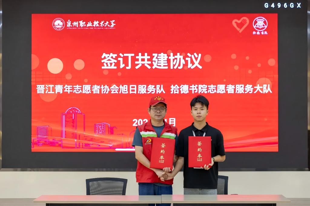 ❖ 泉州职业技术大学拾德书院志愿者服务大队指导老师王泽平与晋江青年志愿者协会旭日服务队队长黄朝阳共同签署了《晋江青年志愿者协会旭日服务队与拾德书院志愿者服务大队结对共建协议书》