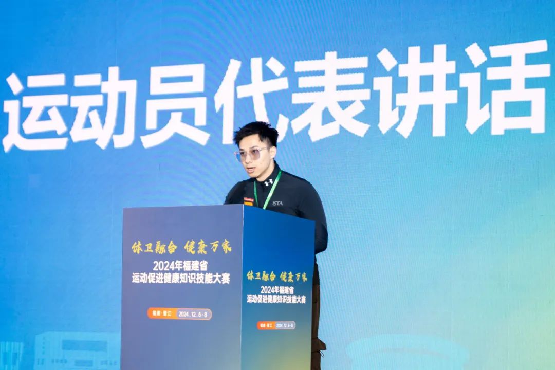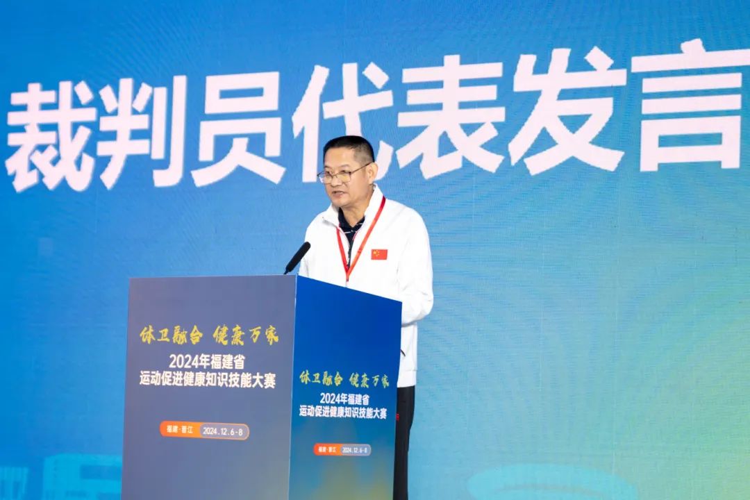 福建省篮排球运动管理中心研究员归予恒作裁判员代表发言,泉州职业技术大学休闲体育教师章天宇作运动员代表讲话。