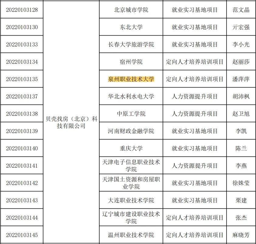 近日,教育部高校学生司发布《关于公布教育部第三期供需对接就业育人项目立项名单的通知》(教就业司函〔2024〕23号)和《关于公布2024年教育部供需对接就业育人项目结题验收结果的通知》(教就业司函〔2024〕22号),我校共有2个项目获批立项,1个项目顺利结项。与珍岛信息技术(上海)股份有限公司合作的《数字商务与智能化创新人才培养项目》和与中青就创(厦门)教育科技有限公司合作的《泉职大-中青就创(厦门)就业实训基地建设》项目立项;与贝壳找房(北京)科技有限公司《定向人才培养培训项目》通过结题验收。