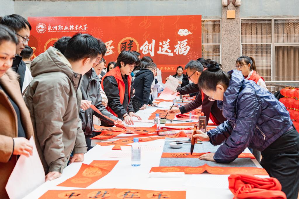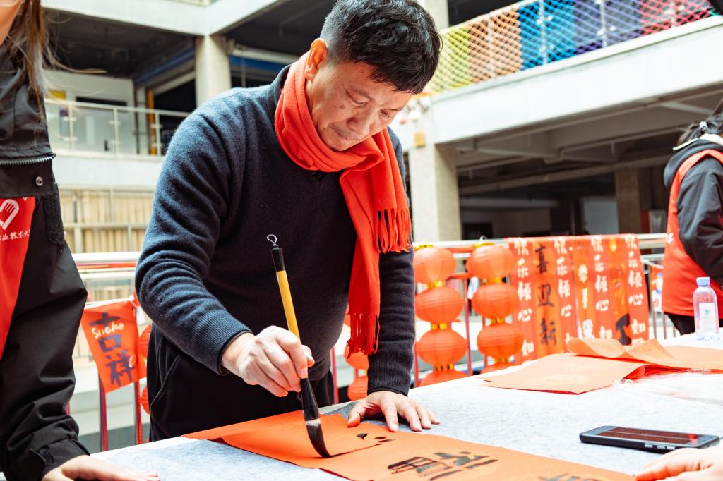 人居环境学院院长关瑞明提笔蘸墨,或将对方的名字巧妙隐含在对联之中,或为大家定制专属“福”字,或按诉求即兴创作场景寄语,一副副饱含巧思的专属祝福跃然纸上,现场气氛被推向了高潮。