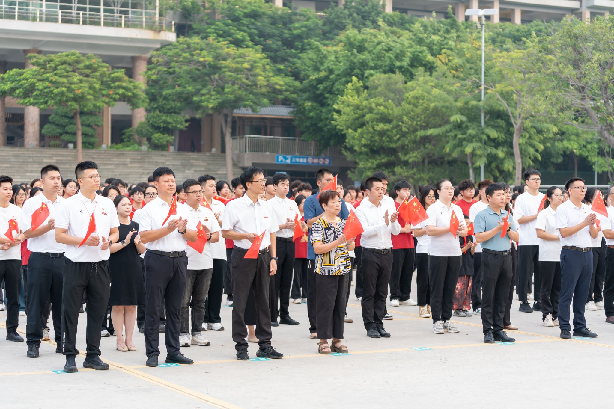 “五星红旗迎风飘扬,胜利歌声多么响亮……”升旗仪式尾声,全体师生齐声高唱《歌唱祖国》,嘹亮的歌声回荡在校园每个角落。师生们挥舞着小国旗,眼中闪烁着激动的光芒,用最真挚的歌声传递对祖国的祝福,用最昂扬的姿态展现泉大青年的活力。
