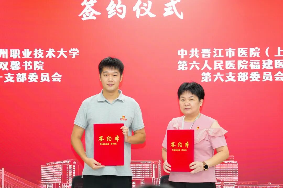 在党支部共建签约环节,双馨书院第一党支部与晋江市医院第六党支部、双馨书院第二党支部与晋江市医院第七党支部分别签署《党支部共建协议书》。根据协议,结对支部将聚焦“七色花”主题童话屋、非遗进儿科病房、“光明助行”眼健康志愿服务、门诊就医体验提升等不同领域开展特色合作。