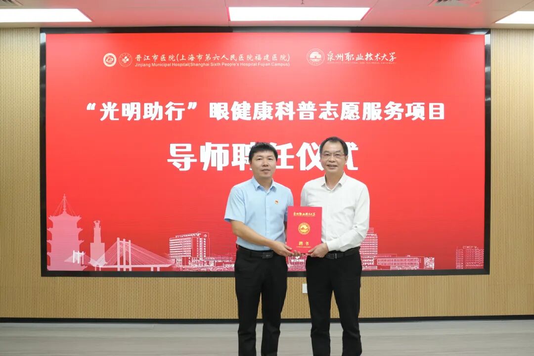 会上还同步举行了“光明助行”眼健康科普志愿服务项目导师聘任仪式,蔡金佩为晋江市医院眼科主任林水龙颁发聘书,聘请其担任该项目志愿服务队专业导师,为科普活动提供科学指导。