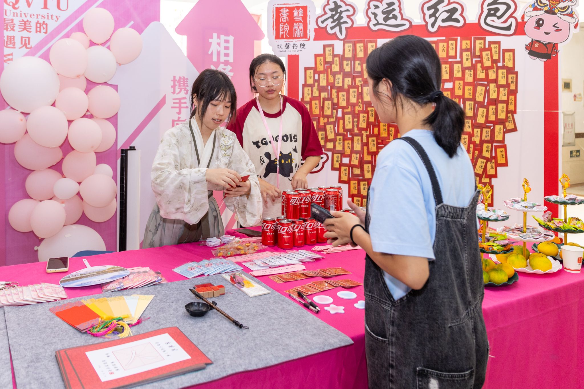 走进双馨书院,一大片心形红包墙映入眼帘。每位新生来到书院,都可以在这里抽取一个红包。每个红包里都藏着祝福语,上面分别写着“前程似锦”“好柿发生”“大吉大利”等。抽完红包后,新生们就能兑换祝福书签、钥匙扣等小礼品。